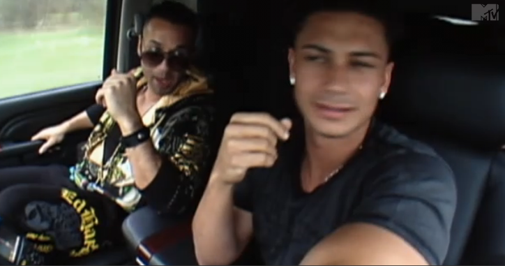 Now it’s time to get reacquainted with Rhode Island’s only most famous deejay, the aptly named DJ Pauly D. He complains how the weather is too cold to go tanning or creeping. Uh, this is coming from a guy who brags about having a tanning bed in his house? Later on, we see him being a perfect gentleman and driving to Mike’s house so the two of them can share a romantic ride down to South Beach.